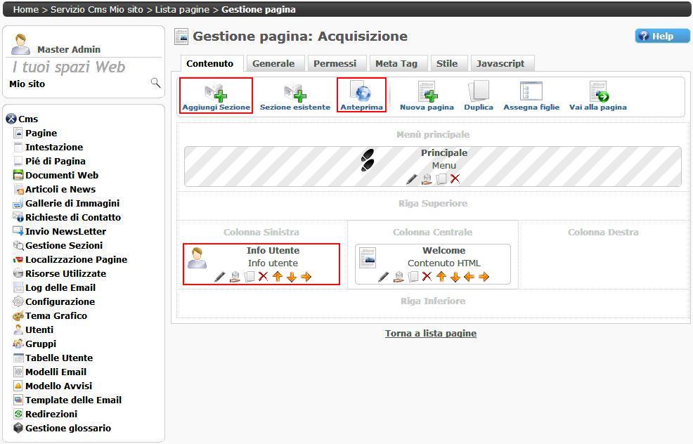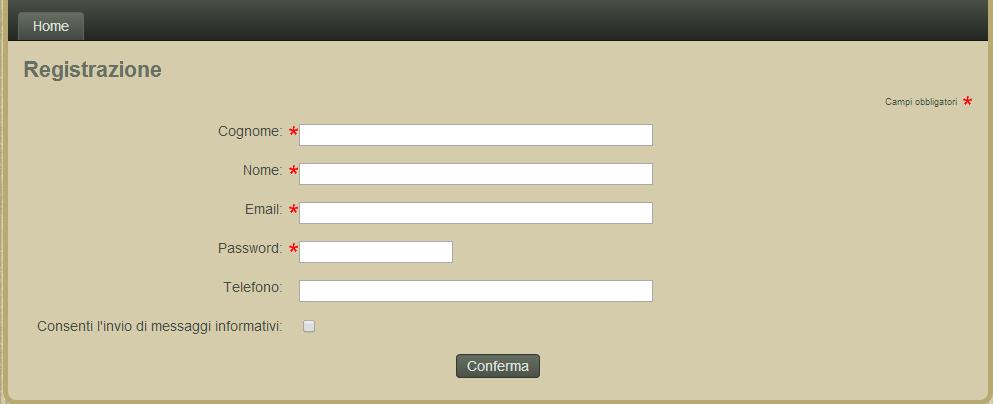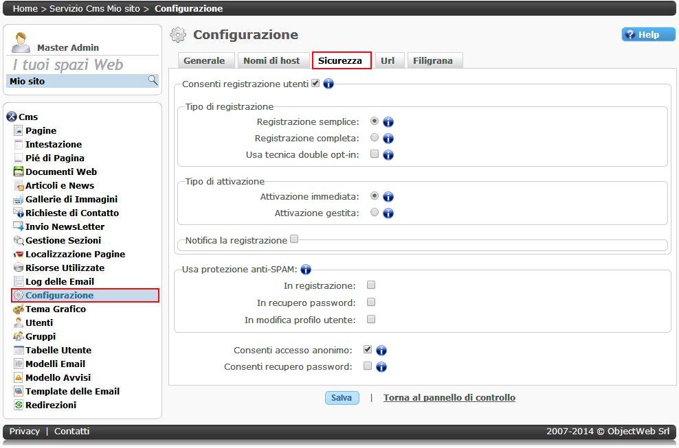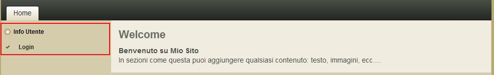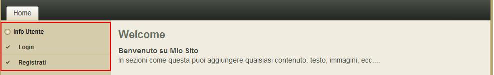 In questo articolo descriveremo la procedura completa poter attivare la registrazione utenti. Dal pannello di controllo clicchiamo su Pagine. Clicchiamo sull'icona Modifica della pagina Home. Aggiungiamo alla pagina la sezione Info Utente e la posizioniamo nella colonna di sinistra. Clicchiamo su Anteprima per visualizzare come si presenta la pagina. La sezione Info Utente consente all'utente di loggarsi ma non di registrarsi. Torniamo nella scheda del browser col pannello di controllo e clicchiamo su Configurazione. Nella scheda Sicurezza selezioniamo la casella di spunta Consenti registrazione utenti e clicchiamo sul bottone Salva. Torniamo nella scheda del browser che visualizza il sito on-line e ricarichiamo la pagina. In seguito all'impostazione precedentemente descritta la sezione Info Utente ora offre all'utente la possibilità di registrarsi. Clicchiamo sul menu registrati per visualizzare la pagina standard di registrazione semplice.