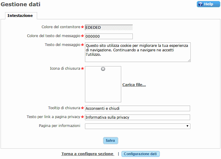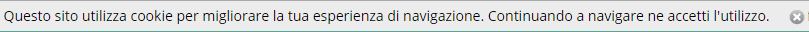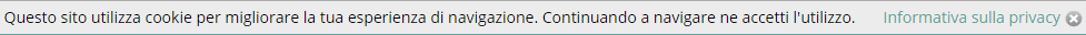 Visualizza il seguente spazio informativo per l'accettazione della politica dei cookie. La posizione in cui lo spazio informativo appare dipende dal tema grafico associato al sito. Nei temi pubblici in genere compare nella parte superiore della pagina. In alcuni temi grafici (una minoranza) appare in basso. Tipicamente la sezione va posizionata in intestazione del sito. Nei temi personalizzati, per un utilizzo corretto, si deve verificare che nella master page sia presente il placeHolder con ID uguale a CookiePlaceHolder. La configurazione può essere personalizzata in ogni sua componente modificando i dati come da immagine seguente Selezionando una Pagina per informazioni dalla lista a discesa che contiene tutte le pagine del sito, comparirà automaticamente il link Informativa sulla privacy che porta alla pagina selezionata.
