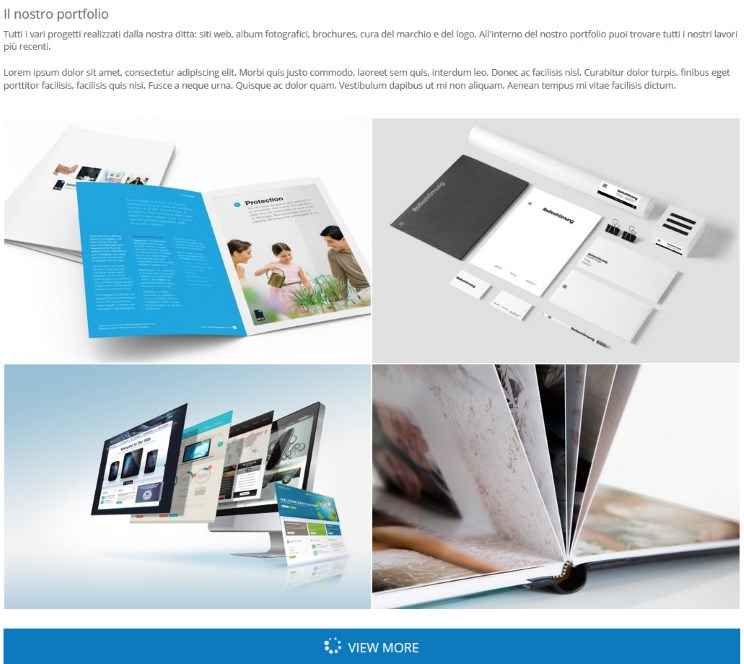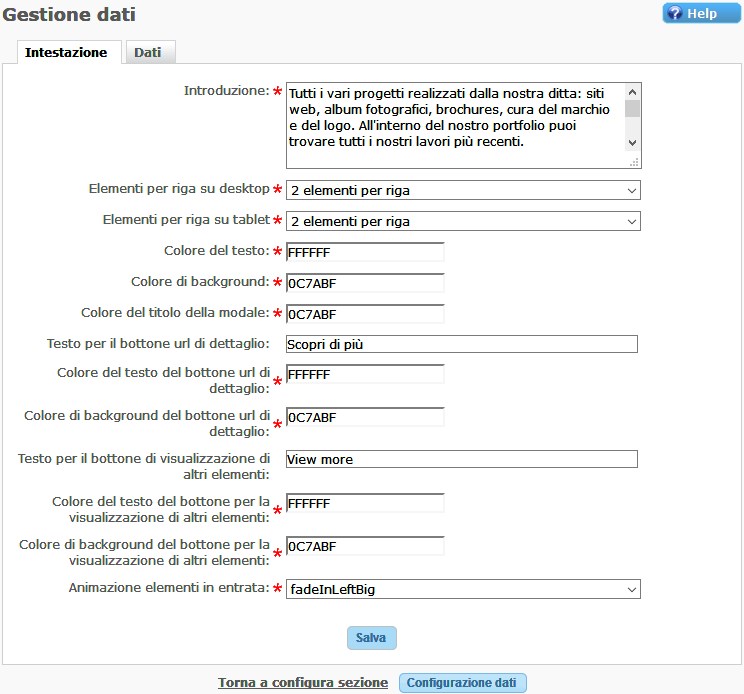 Il plug-in prevede dei parametri generici di intestazione con cui è possibile impostare il numero di elementi visualizzati per riga su desktop e tablet, il colore dello strato semitrasparente, il colore del font,