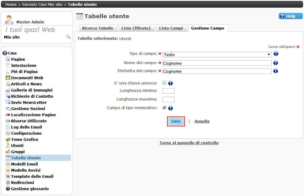 Per il campo Nome usiamo l'accortezza, come per il campo Cognome, di selezionare la casella di opzione Tipo di campo nominativo. Questo consentira, come vedremo, di associare il campo Cognome e Nome alla tabella utenti di sistema.