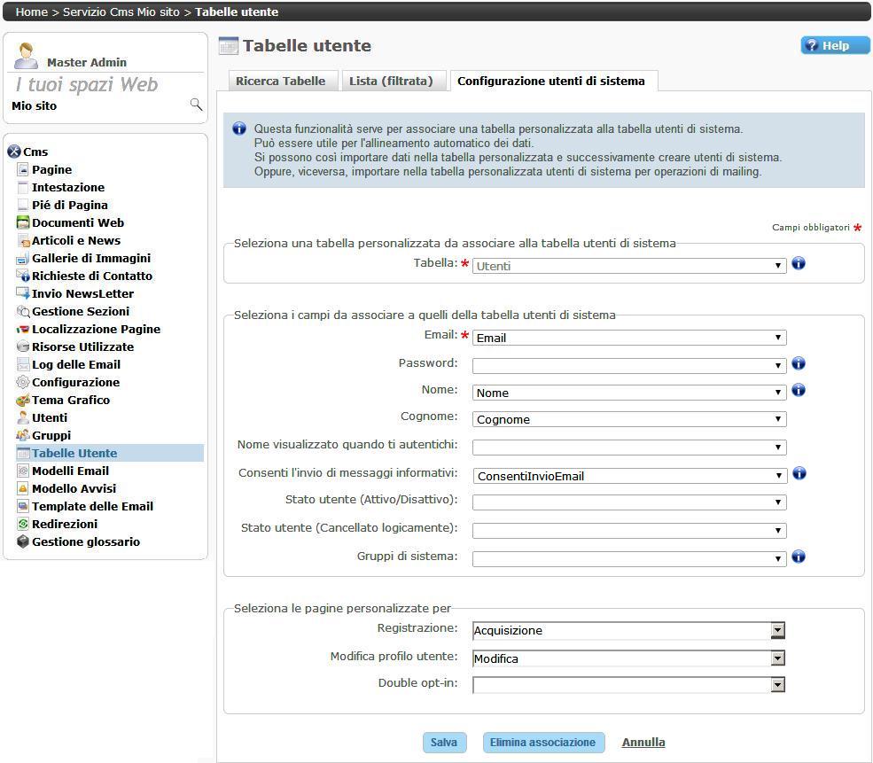 Tra tutte le tabelle definite possono essere associate solo quelle tabelle che contengono un campo di tipo email indicato come chiave univoca.
