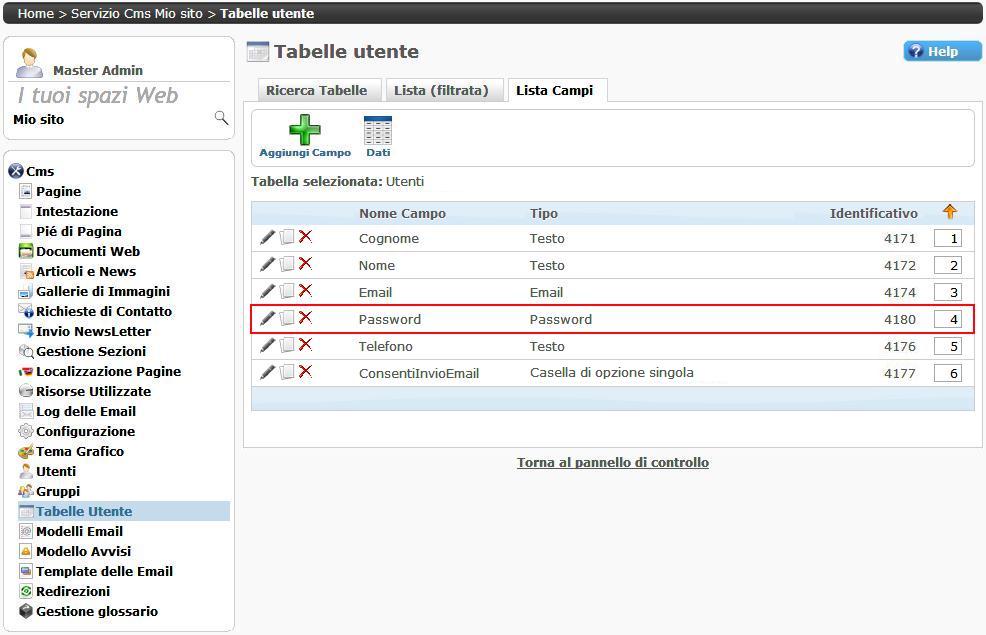 Una volta effettuata l'associazione e possibile aggiungere alla tabella anche un campo di tipo Password. Lo assoceremo poi al campo Password della tabella utenti di sistema come abbiamo fatto per gli altri campi.