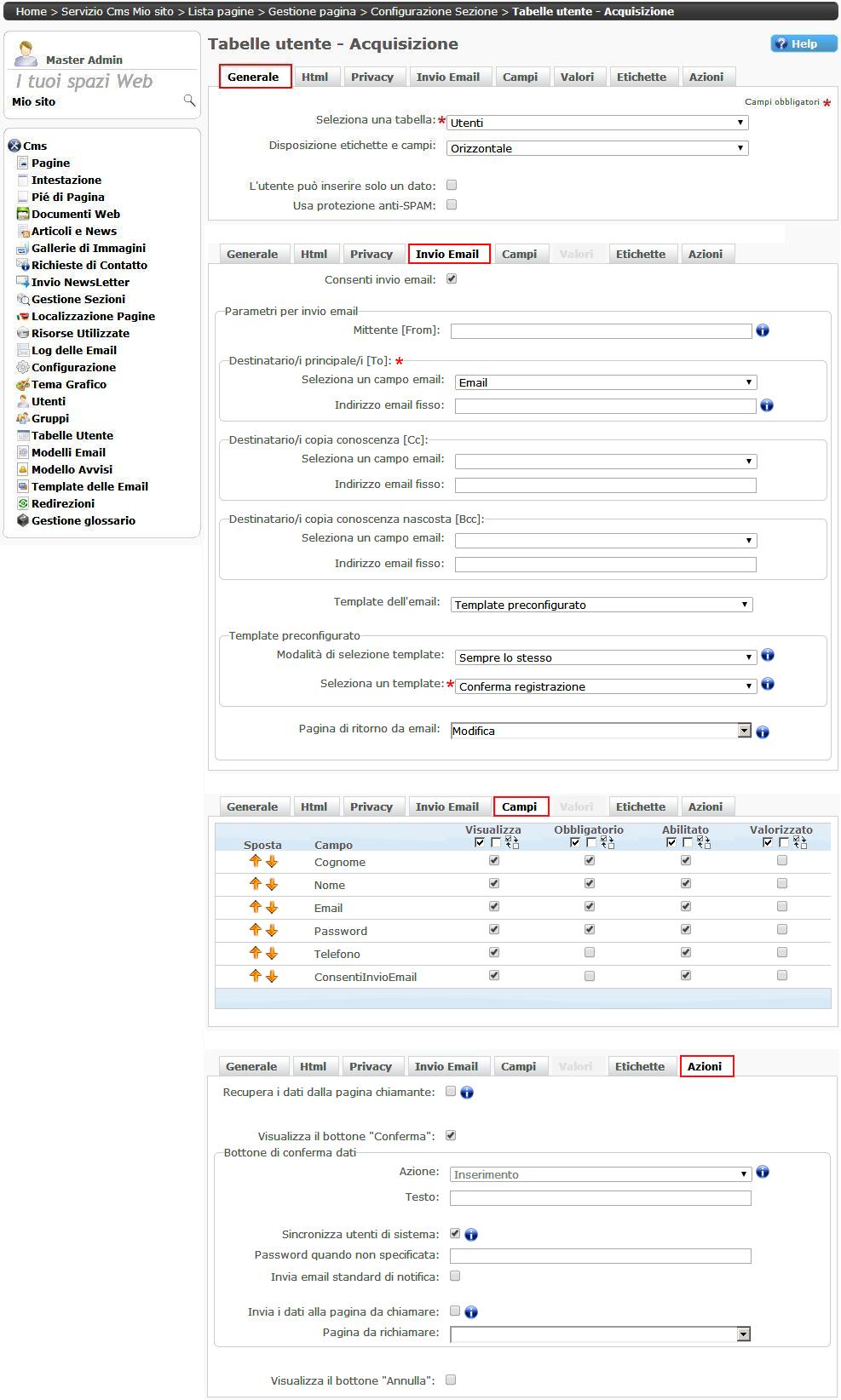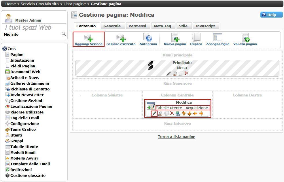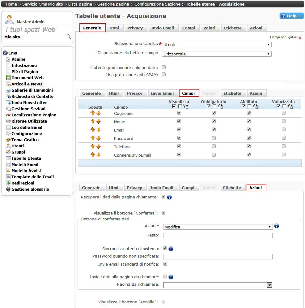 La sezione da inserire nella pagina è ancora una volta una sezione di tipo Tabelle utente - Acquisizione (in questo caso il nome della tipologia di sezione è un poco deviante).