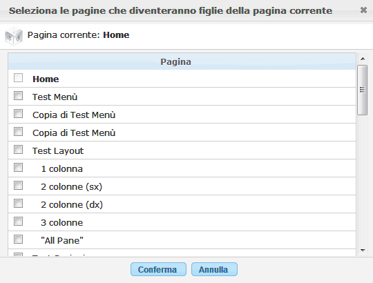 Apre una finestra di dialogo da dove è possibile assegnare (spuntando la pagina) le pagine figlie alla pagina che si sta modificando.