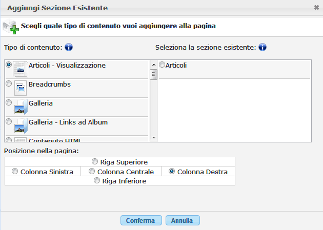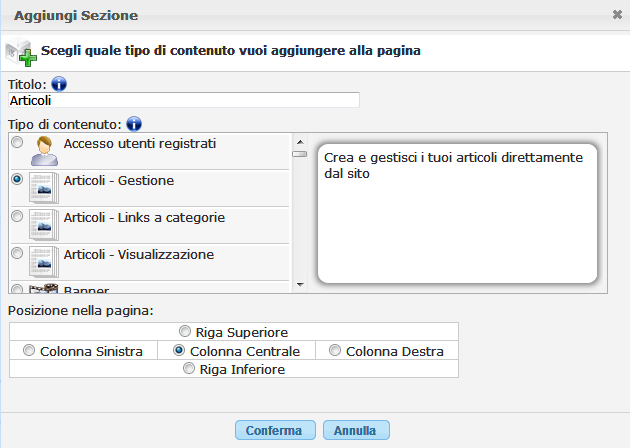 di sezione, la scelta del tipo di contenuto e la posizione in cui inserirlo. Cliccando sul bottone "Conferma" viene