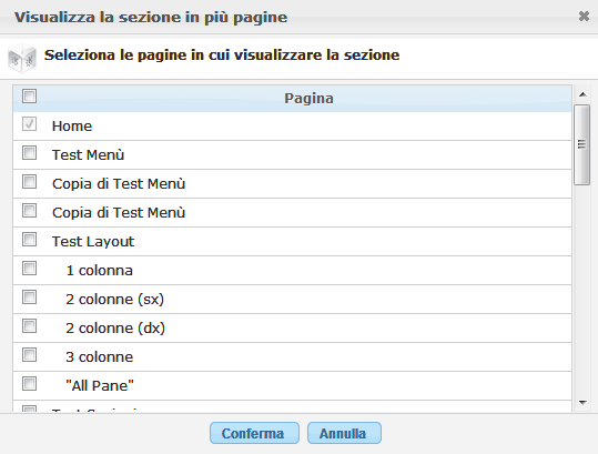 che consente di specificare su quali pagine dello spazio web condividere la sezione; le pagine con il segno di spunta contengono la